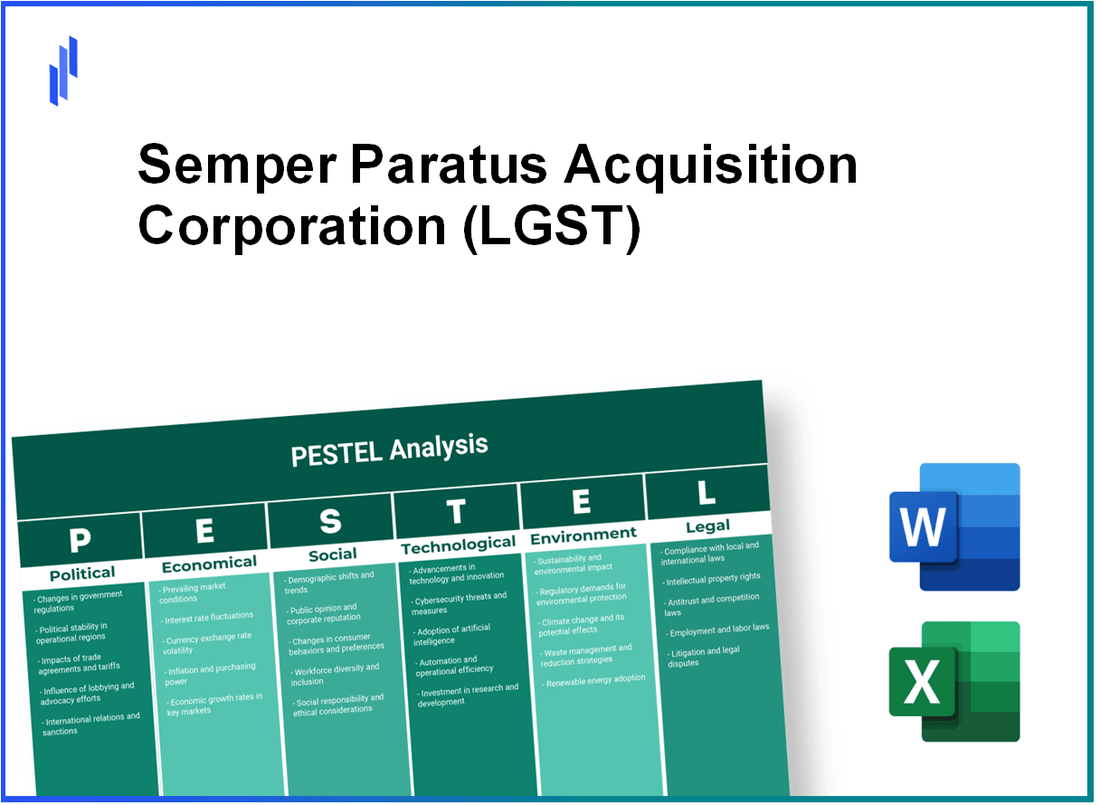 Dans la tapisserie complexe des affaires modernes, la compréhension de la myriade d'influences façonner le paysage d'une entreprise est essentielle. Pour Semper Paratus Acquisition Corporation (LGST), un Analyse des pilons Offre des informations profondes sur les facteurs politiques, économiques, sociologiques, technologiques, juridiques et environnementaux qui stimulent ses opérations. Découvrir comment réglementation gouvernementale, dynamique du marché, et l'évolution en constante évolution paysage technologique entrelacer pour avoir un impact sur sa trajectoire commerciale unique. Plongez plus profondément pour découvrir les facteurs qui détiennent à la fois les défis et les opportunités pour LGST ci-dessous.